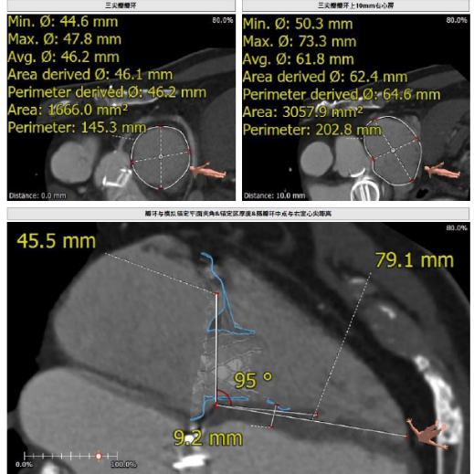 接受本次治療的是一例三尖瓣重度反流的患者,NYHA心功能Ⅲ級。主訴“反復(fù)活動后氣促1年,下肢水腫4個月”。入院N末端B型腦鈉肽前體(NT-proBNP)3161pg/ml。心電圖提示:心房顫動,ST-T改變。術(shù)前超聲提示:重度三尖瓣關(guān)閉不全,右心房擴大,三尖瓣收縮期位移(TAPSE)14mm,左房增大,左室收縮功能正常低值,主動脈瓣、二尖瓣機械瓣功能良好。術(shù)前CT評估(圖1):三尖瓣瓣環(huán)(周長換算直徑)大小為46.2mm;入路血管無嚴(yán)重迂曲,無鈣化;雙側(cè)冠脈有鈣化。