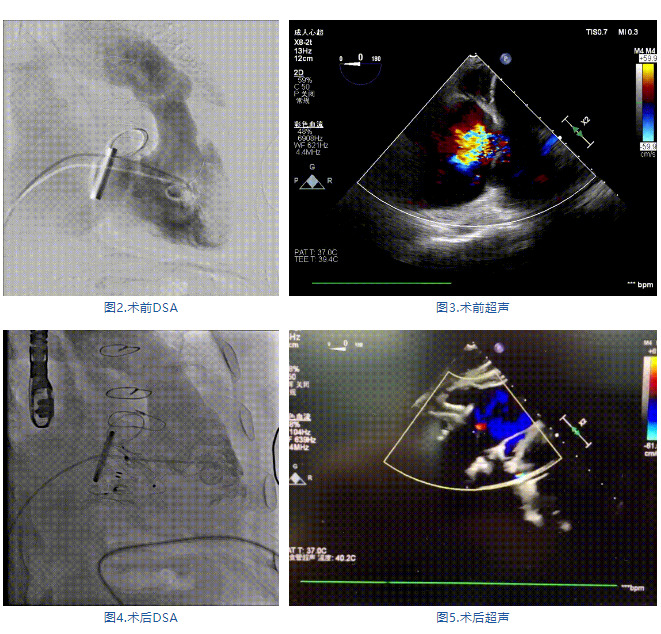 手術(shù)在全麻狀態(tài)下進行,郭惠明教授團隊采用經(jīng)右側(cè)頸靜脈入路的方式送入輸送器進入體內(nèi),并在TEE和DSA的指引下進行。在輸送器進入右室后釋放室間隔錨定裝置,旋轉(zhuǎn)輸送器,使得錨定裝置對準(zhǔn)室間隔面;而后釋放前瓣夾持件,確定夾持件位于右室側(cè)釋放LuX-Valve Plus人工瓣膜盤片,再使用DSA和超聲確認(rèn)盤片是否位于右房側(cè),同時調(diào)整瓣膜的同軸性。緊接著在DSA和超聲的監(jiān)視下調(diào)整室間隔錨定件貼合室間隔,釋放室間隔錨定裝置。再次確認(rèn)瓣膜的穩(wěn)定性和同軸性后,將輸送器撤出體內(nèi),最終完成LuX-Valve Plus人工瓣膜植入(圖2-5),手術(shù)獲得圓滿成功。患者在手術(shù)室即刻拔除氣管插管,術(shù)后超聲提示LuX-Valve Plus人工三尖瓣瓣膜同軸性良好,瓣架固定牢靠,無反流和瓣周漏。