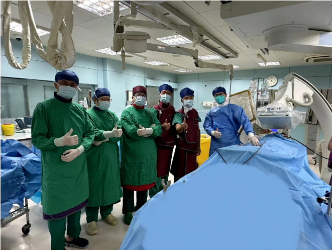 在阜外醫(yī)院潘湘斌教授團(tuán)隊(duì)的支持下,手術(shù)經(jīng)股靜脈-房間隔入路,采用全身麻醉插管,在TEE和DSA引導(dǎo)下完成房間隔穿刺。置入JensClip瓣膜夾系統(tǒng)后,在左房調(diào)整瓣膜夾的位置和軸向,后進(jìn)入左室,在TEE引導(dǎo)下捕捉二尖瓣前后瓣葉,并關(guān)閉瓣膜夾。經(jīng)TEE反復(fù)確認(rèn)手術(shù)效果后最終鎖定并釋放瓣膜夾。術(shù)后即刻超聲顯示瓣膜夾位置穩(wěn)定,功能良好,二尖瓣反流由術(shù)前4+減少至微量,手術(shù)圓滿成功。