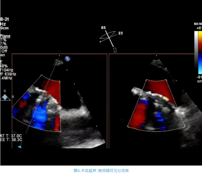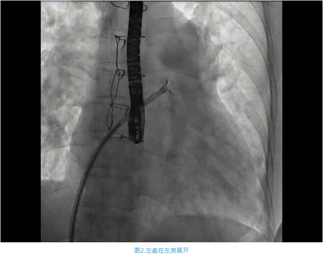術(shù)中首先在局麻下穿刺股動(dòng)脈、股靜脈,完成心導(dǎo)管檢查評(píng)估后轉(zhuǎn)為全麻,在食道超聲引導(dǎo)下穿刺房間隔,穿刺成功后將加硬導(dǎo)絲送入左上肺靜脈建立軌道,根據(jù)患者病情行球囊預(yù)擴(kuò)張后植入6mm孔徑房間隔造孔支架,經(jīng)透視及食道超聲評(píng)估支架左右盤展開良好,夾持于房間隔兩側(cè),固定穩(wěn)定、位置良好,食道彩超顯示房水平右向左為主分流,分流孔直徑符合預(yù)期大小,心導(dǎo)管檢查評(píng)估達(dá)到預(yù)期效果,釋放造孔支架。術(shù)后12h患者下床活動(dòng),恢復(fù)順利,擬于近日完善術(shù)后評(píng)估后出院。