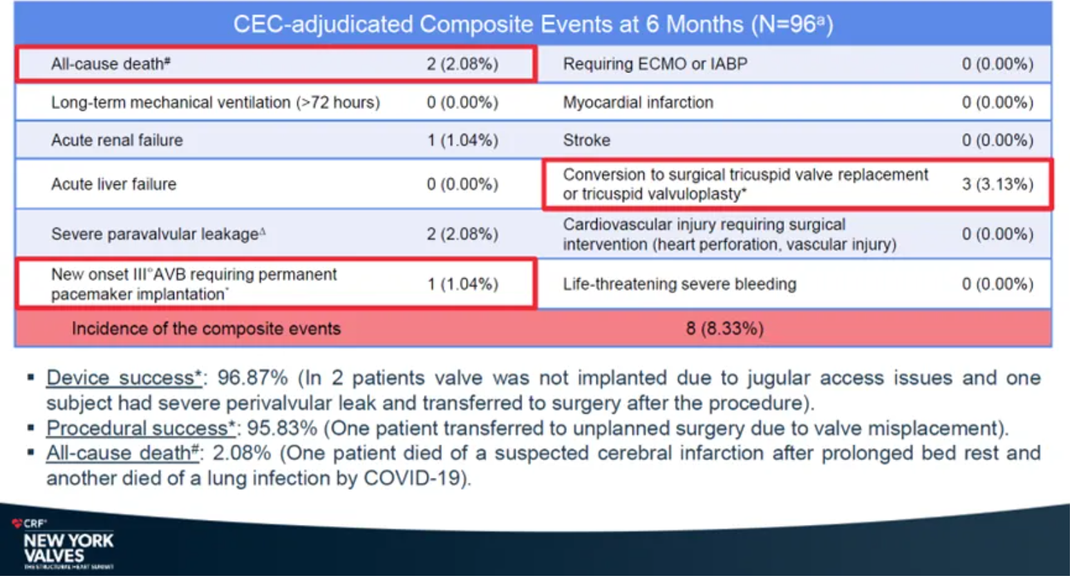 安全性結(jié)果顯示,復(fù)合事件發(fā)生率為8.33%。心梗、卒中、使用ECMO(體外膜肺氧合)或IABP(主動(dòng)脈內(nèi)球囊反搏)、急性肝功能衰竭、長(zhǎng)期機(jī)械通氣(>72小時(shí))、需要外科干預(yù)的心血管損傷(心臟穿孔、血管損傷)、危及生命的大出血事件發(fā)生率均為0。全因死亡率僅為2.08%,急性腎臟衰竭、重度瓣周漏和中轉(zhuǎn)外科三尖瓣置換或成形術(shù)發(fā)生率分別為1.04%、2.08%和3.13%。新發(fā)III度房室傳導(dǎo)阻滯需植入永久心臟起搏器的發(fā)生率僅1.04%。