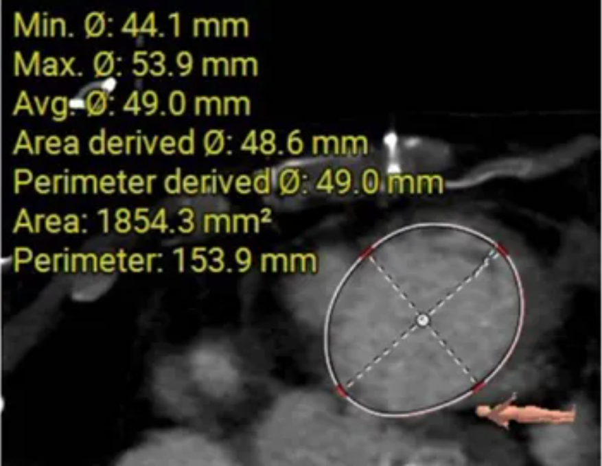 術(shù)前CT測(cè)量:三尖瓣瓣環(huán)最大徑53.9mm,周長(zhǎng)平均徑49mm,瓣環(huán)顯著擴(kuò)張。