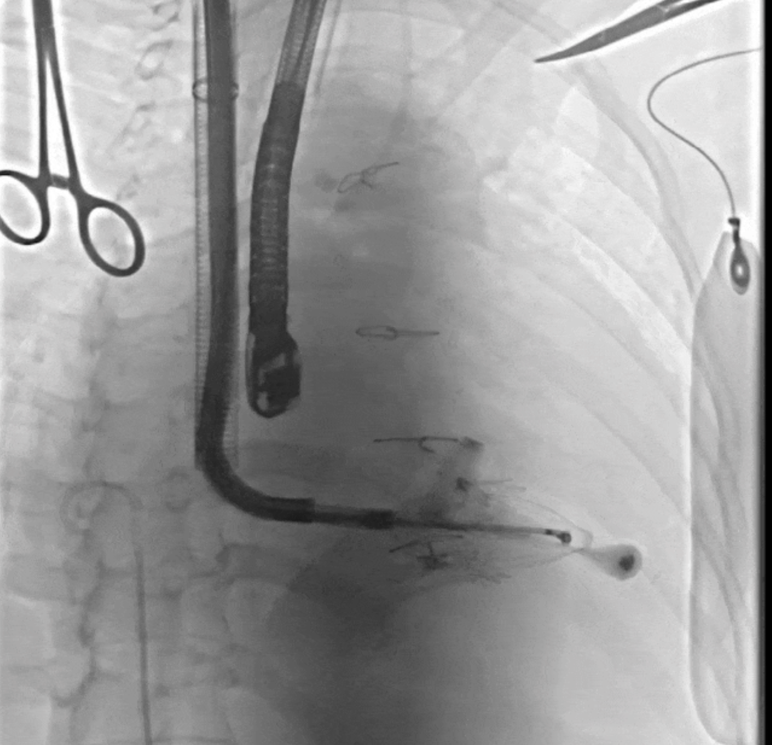 術(shù)中DSA所見(jiàn):經(jīng)LuX-Valve Plus輸送器系統(tǒng)五向調(diào)整,人工瓣膜同軸良好,夾持件均在瓣葉下。