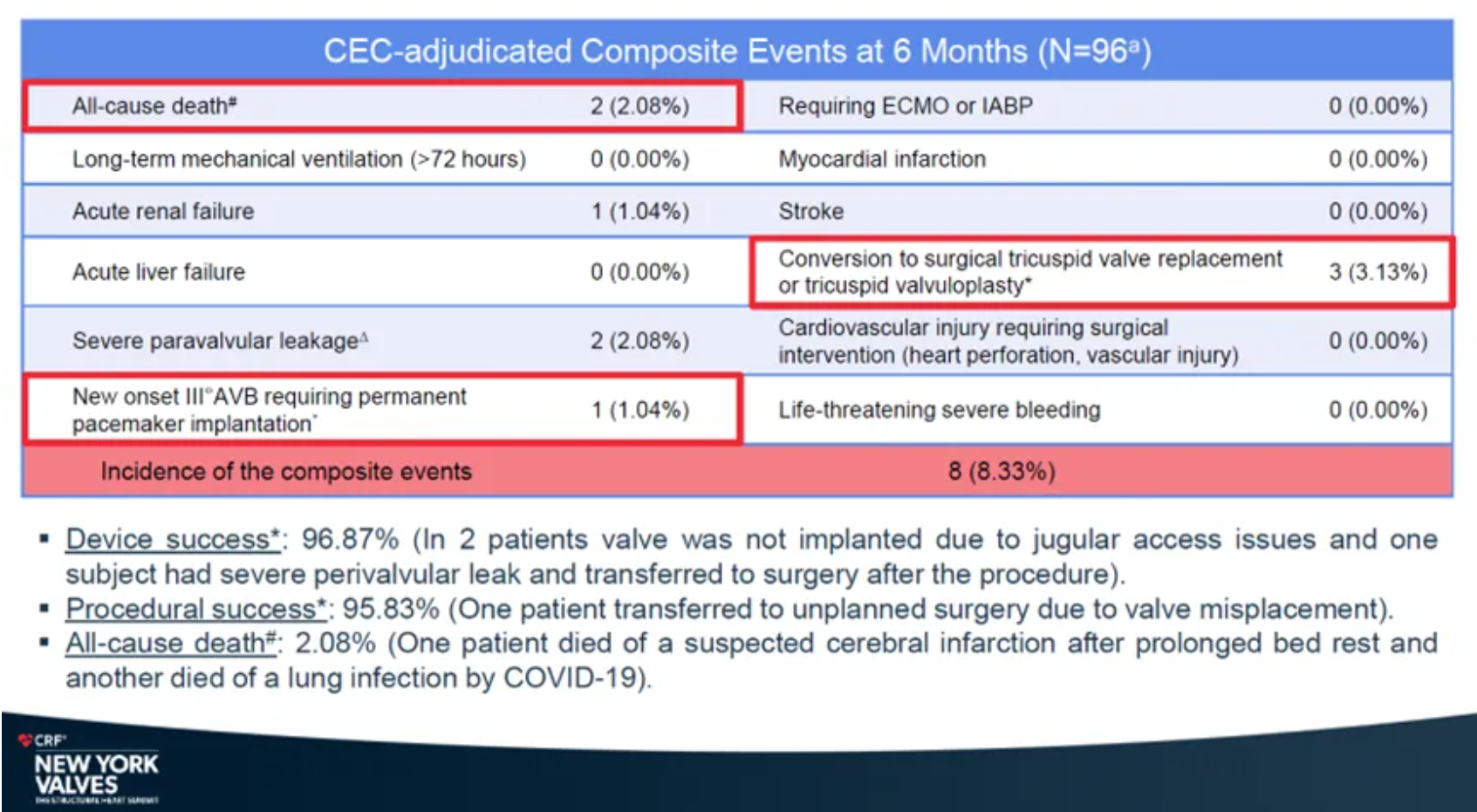 安全性結(jié)果顯示,復(fù)合事件發(fā)生率為8.33%。心梗、卒中、使用ECMO(體外膜肺氧合)或IABP(主動(dòng)脈內(nèi)球囊反搏)、急性肝功能衰竭、長(zhǎng)期機(jī)械通氣(>72小時(shí))、需要外科干預(yù)的心血管損傷(心臟穿孔、血管損傷)、危及生命的大出血事件發(fā)生率均為0%。全因死亡率僅為2.08%,急性腎臟衰竭、重度瓣周漏和中轉(zhuǎn)外科三尖瓣置換或成形術(shù)發(fā)生率分別為1.04%、2.08%和3.13%。新發(fā)III度房室傳導(dǎo)阻滯需植入永久心臟起搏器的發(fā)生率僅1.04%。