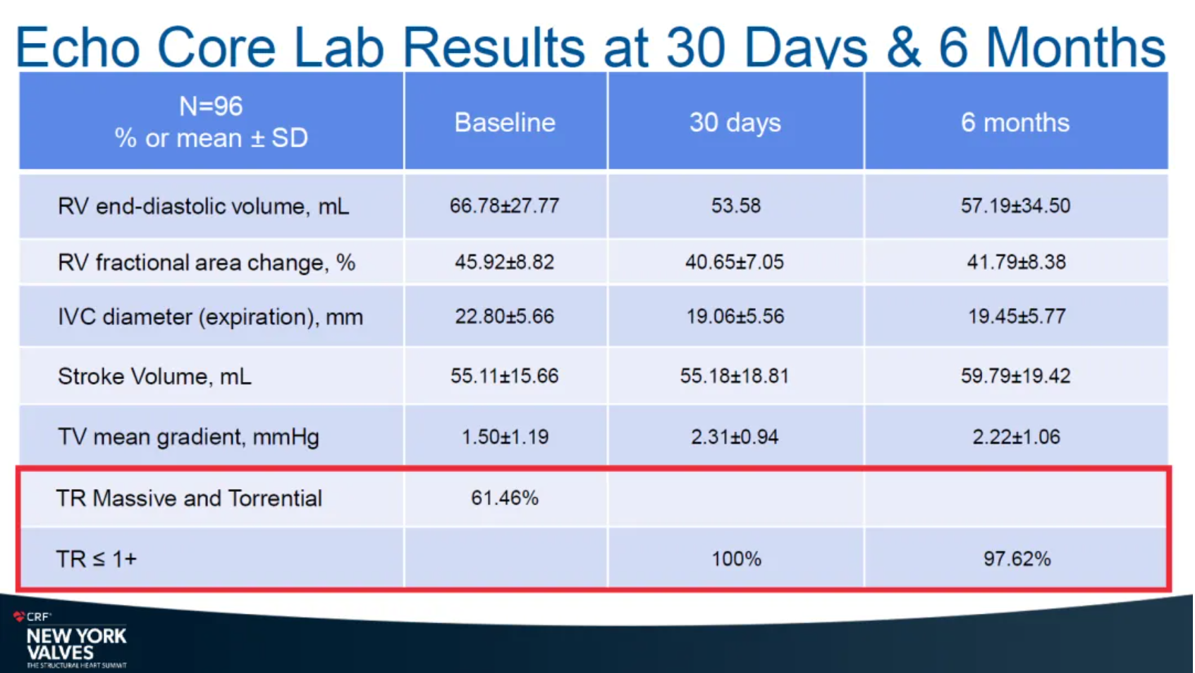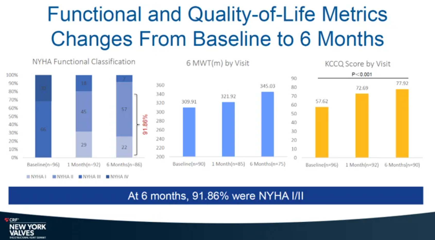 有效性結(jié)果顯示,患者的反流等級(jí)、心功能等級(jí),以及生活質(zhì)量顯著改善。100%的患者在30天顯示無(wú)中度及以上反流,97.62%的患者在6個(gè)月期時(shí)顯示無(wú)中度及以上反流。同時(shí),根據(jù)超聲數(shù)據(jù)顯示,患者右心系統(tǒng)重構(gòu)也獲得受益。