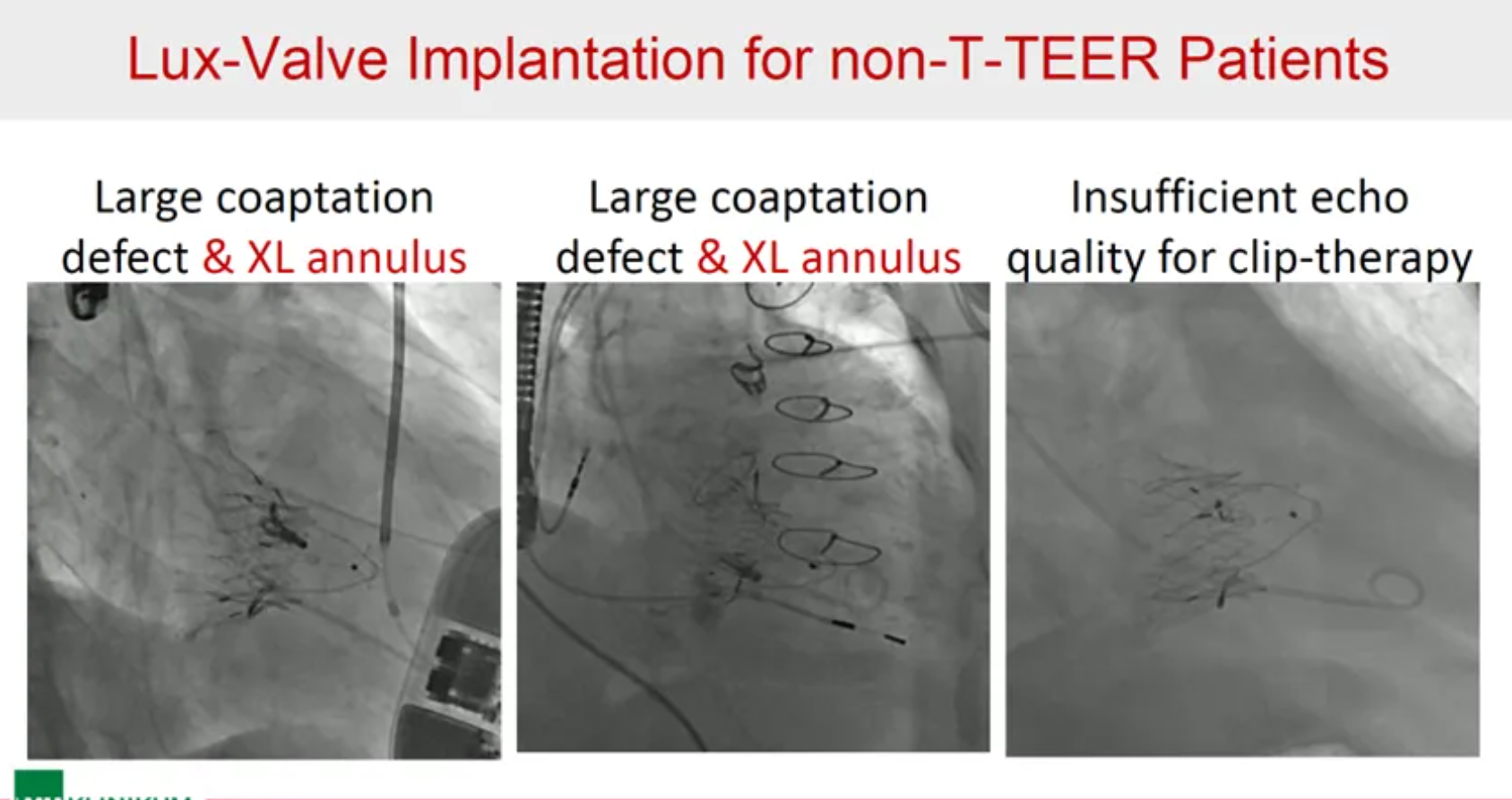 隨后在2024年紐約瓣膜會(huì)上,Hausleiter教授再次提及LuX-Valve Plus,并介紹到對(duì)于不適合做T-TEER術(shù)式的患者也是適用的,并且能夠擴(kuò)大治療方式的選擇,例如瓣口接合有較大缺陷和超大瓣環(huán)的患者,以及超聲影像質(zhì)量較低不適合夾子術(shù)式等情況。Hausleiter教授表示LuX-Valve Plus展現(xiàn)了優(yōu)異的的早期臨床表現(xiàn)。