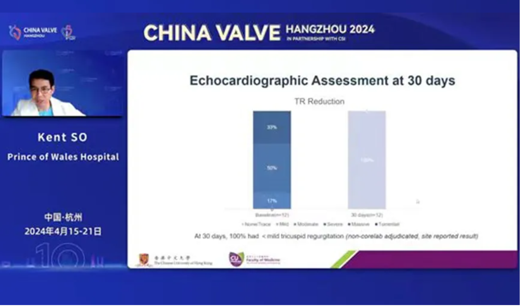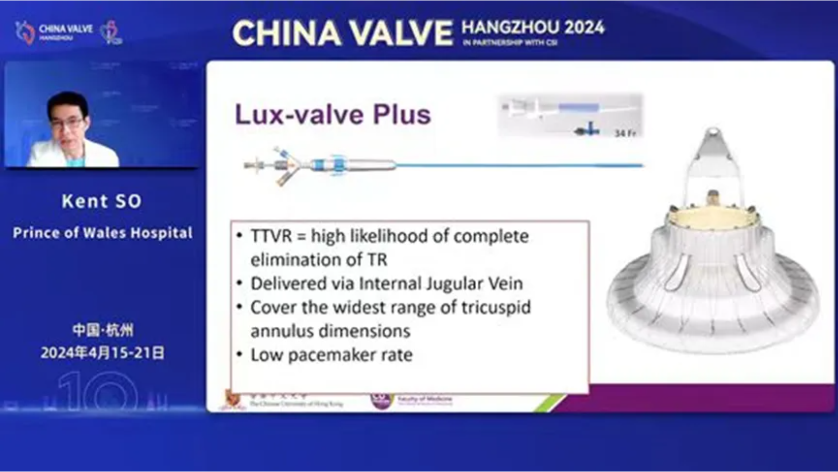 LuX-Valve Plus早期在香港的臨床數(shù)據(jù)和經(jīng)驗(yàn)由來(lái)自中國(guó)香港威爾斯親王醫(yī)院(Prince of Wales Hospital, Hong Kong, China)的Kent SO(蘇澤宇)教授在2024杭州瓣膜會(huì)上進(jìn)行了分享,并且指出這是一款有潛力的TTVR器械,能覆蓋較廣范圍的三尖瓣瓣環(huán)尺寸并帶能降低起搏器的植入率,展現(xiàn)了良好的術(shù)中和短期治療效果。