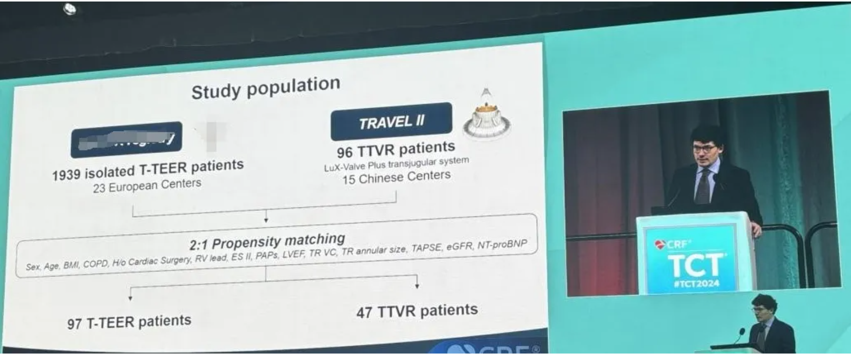 此外,來(lái)自美國(guó)心血管研究基金會(huì)(Cardiovascular Research Foundation, New York, U.S.)的Guido Ascione博士進(jìn)行了一項(xiàng)有癥狀的三尖瓣反流高?;颊逿-TEER與TTVR的一年臨床結(jié)果的傾向評(píng)分匹配分析。研究和分析中發(fā)現(xiàn),在以L(fǎng)uX-Valve Plus TRAVEL II一年期隨訪(fǎng)數(shù)據(jù)作為T(mén)TVR數(shù)據(jù)的引用的背景下,TTVR相對(duì)于T-TEER在三尖瓣反流問(wèn)題解決層面有著更高的術(shù)式成功率,且一年后的臨床結(jié)果和功能評(píng)分中,置換和緣對(duì)緣相比并無(wú)統(tǒng)計(jì)學(xué)差異。