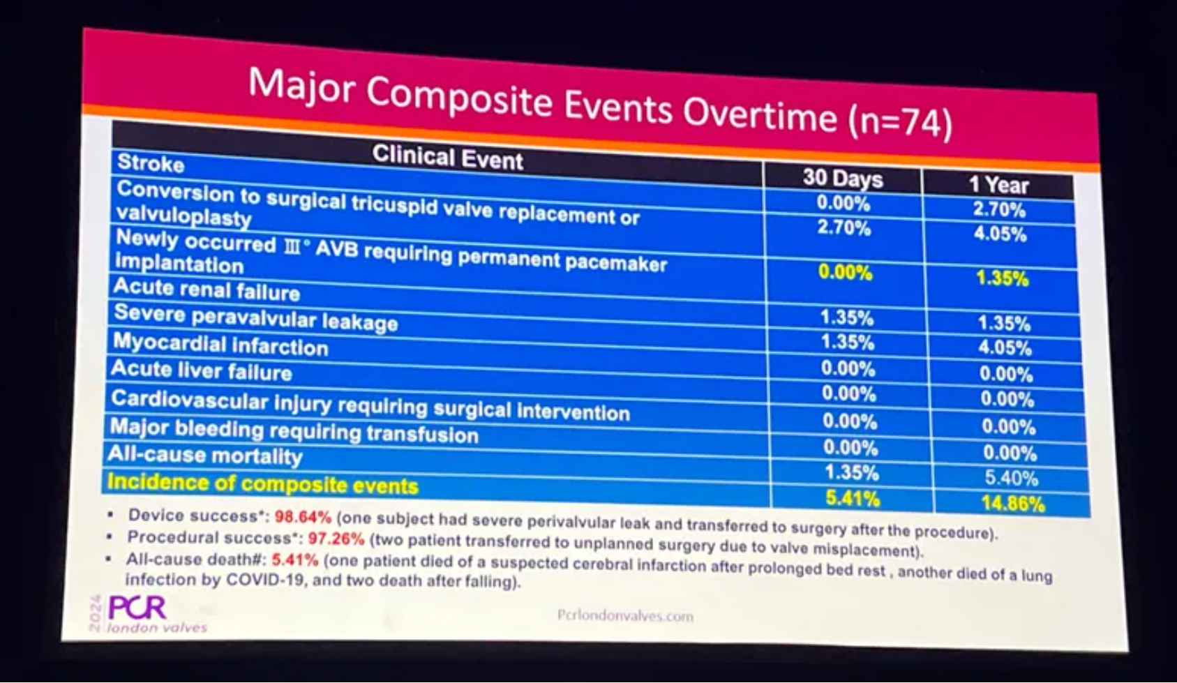 安全性結(jié)果顯示,復(fù)合事件發(fā)生率為12.50%,依然維持在較低水平。心梗、使用ECMO(體外膜肺氧合)或IABP(主動(dòng)脈內(nèi)球囊反搏)、急性肝功能衰竭、長(zhǎng)期機(jī)械通氣(>72小時(shí))、需要外科干預(yù)的心血管損傷(心臟穿孔、血管損傷)、危及生命的大出血事件發(fā)生率均為0%。全因死亡率僅為4.17%,急性腎臟衰竭、重度瓣周漏和中轉(zhuǎn)外科三尖瓣置換或成形術(shù)發(fā)生率分別為1.04%、2.08%和3.13%。新發(fā)III度房室傳導(dǎo)阻滯需植入永久心臟起搏器的發(fā)生率僅2.08%。